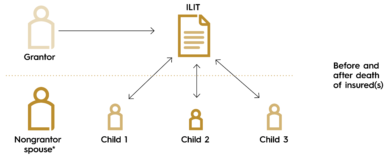 Married business owners who are looking for life insurance to be owned within an irrevocable trust for estate tax or asset protection reasons, but want access to the cash value and death benefit for the non-grantor spouse. They may: